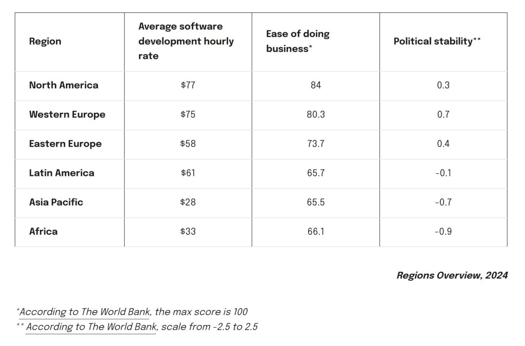 As you can see from the table, the difference in numbers for Asia, Africa and the so-called Western World is striking. In the article, it is explained by the differences in cost of life, seniority and professionalism of the development teams and cultural specificities in each region of the world.